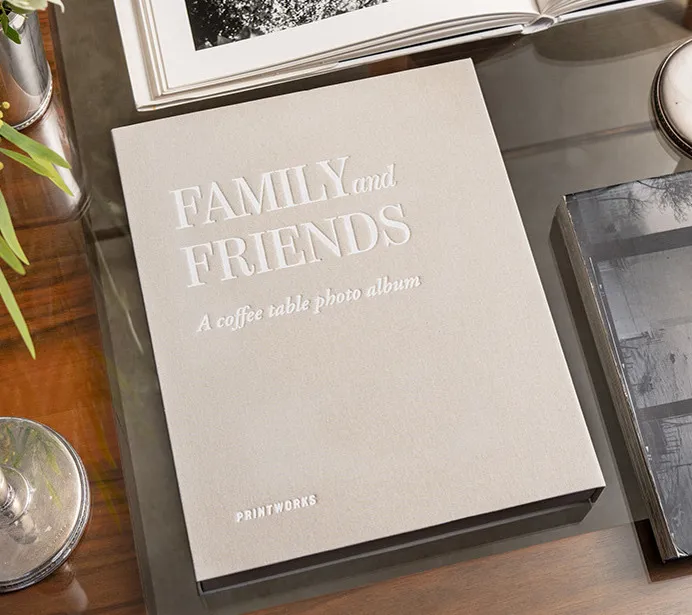 Discover our Family and Friends Coffee Table Photo Album with an elegant light grey cloth cover and white text. Stick your favorite photos in this still-empty album; the high-quality black photo paper accommodates two 10 x 15 cm photos per page and leaves space for notes. The book has 30 pages sized 19 x 20.5 cm.