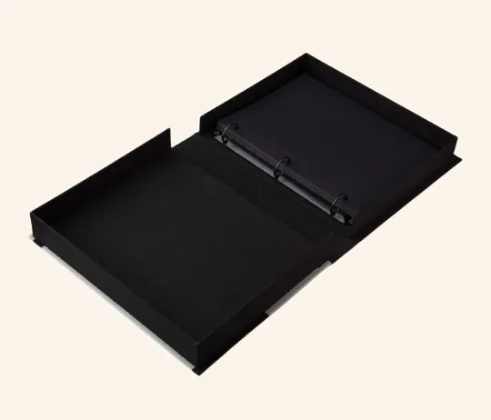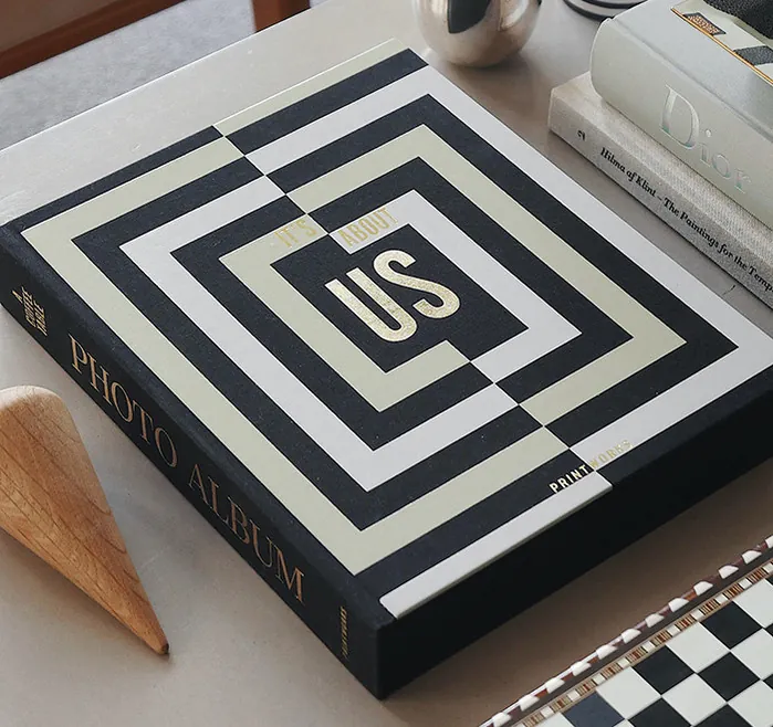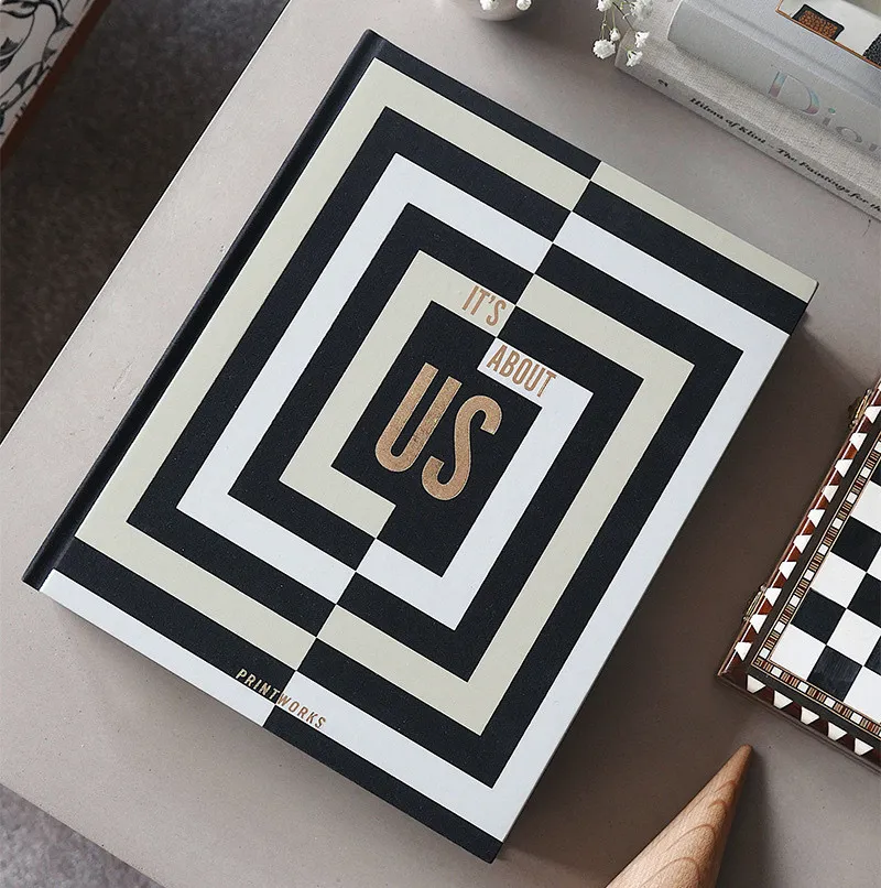 Discover our It's About Us Coffee Table Photo Album with a multicolor cloth cover in black, gold, and white with gold foiled text. It includes 30 pages of high-quality black photo paper, holding two 10x15 cm photos per page, with space for notes.